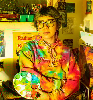 En mi trabajo fusiono pintura, fotografía, ilustración y diseño para explorar nuevas formas de comunicación. Mi estilo es expresivo y vibrante; me gusta experimentar y resaltar cómo los colores evocan emociones en el espectador. También soy conocida como Radiante, un proyecto de ilustración, merchandising y diseño con el que promuevo ambientes positivos en mi ciudad bajo la frase: "Hagamos a Tijuana radiante".