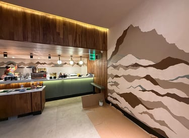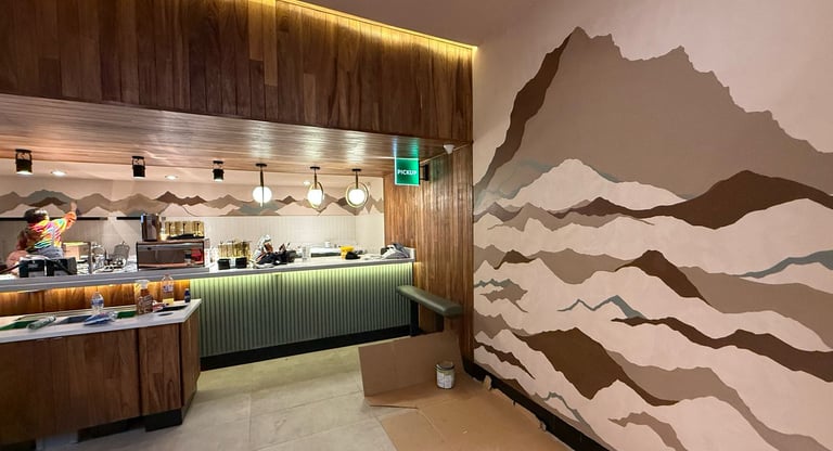 Mural decorativo para la fachada de Starbucks, inspirado en los horizontes característicos de la ciudad y la paleta de colores tierra que evocan la esencia del café. Una intervención que conecta la identidad corporativa con el paisaje local, creando un ambiente cálido y representativo para los viajeros.