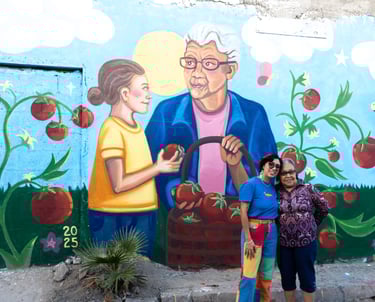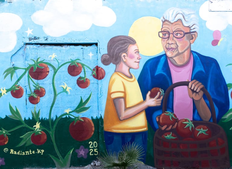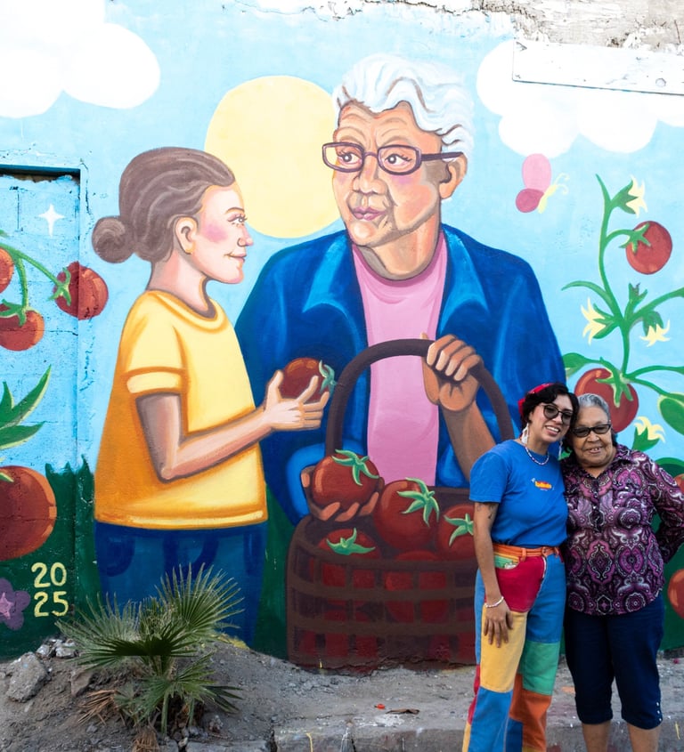 Proyecto autogestivo, en colaboración con Comex, Ediciones Caradura, Radiante y más de 10 muralistas locales, donde abrimos las puertas a artistas emergentes dentro de la comunidad tijuanense. Mi mural rinde homenaje a las abuelas mexicanas, portadoras de sabiduría y amor, quienes nos comparten su legado a través de los alimentos que nacen del huerto, como los tomates.