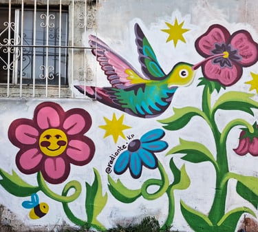 Mural colectivo en Heta Galería, inspirado en el simbolismo del colibrí y en el origen náhuatl del nombre de la calle donde se ubica la galería: lugar donde abundan los colibríes. La obra resalta al colibrí en su acto polinizador, símbolo de armonía y equilibrio en su hábitat natural, en estrecha conexión con las plantas que lo rodean.