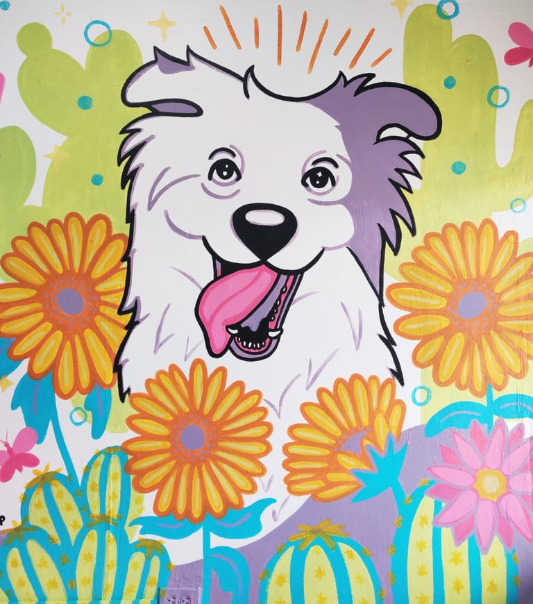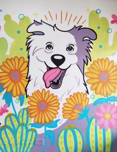 Mural para Garapet, estética canina, inspirado en su mascota y logotipo principal. Esta obra fusiona ilustraciones personalizadas con muralismo, creando una identidad visual única para el local y resaltando su amor por